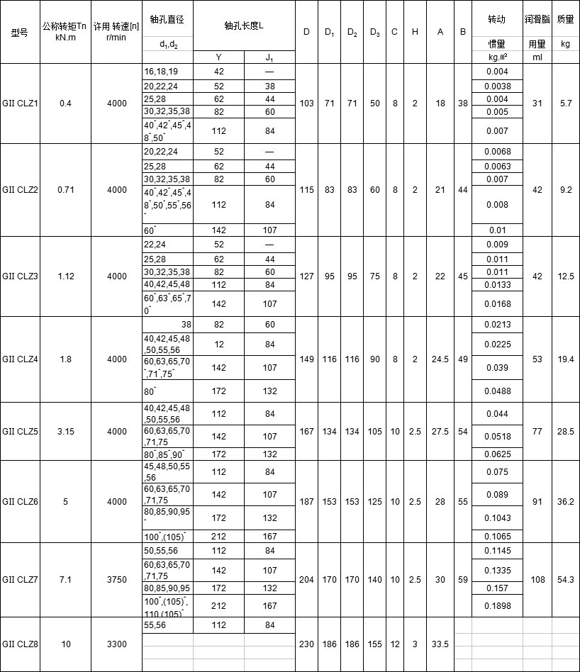 GⅡCLZ型鼓形齿式联轴器的参数和主要尺寸:(JB/T 8854.2-2001) mm